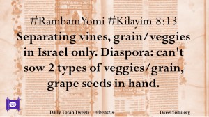 #RambamYomi #Kilayim 8:13 Separating vines, grain/veggies in Israel only. Diaspora: can’t sow 2 types of veggies/grain, grape seeds in hand.