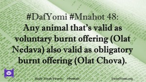 DafYomi, Mnahot #DafYomi #Mnahot 48 Date: September 27, 2018Author: ysspitz #DafYomi #Mnahot 48: Any animal that’s valid as voluntary burnt offering (Olat Nedava) also valid as obligatory burnt offering (Olat Chova). Share this: Share on X (Opens in new window) X Share on Facebook (Opens in new window) Facebook Like Loading... Related