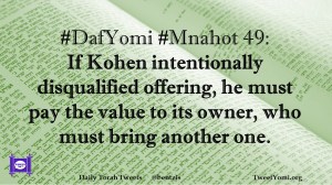 DafYomi, Mnahot #DafYomi #Mnahot 49 Date: September 28, 2018Author: ysspitz #DafYomi #Mnahot 49: If Kohen intentionally disqualified offering, he must pay the value to its owner, who must bring another one. Share this: Share on X (Opens in new window) X Share on Facebook (Opens in new window) Facebook Like Loading... Related