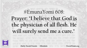 EmunaYomi #EmunaYomi 608 Date: September 28, 2018Author: ysspitz #EmunaYomi 608: Prayer: “I believe that God is the physician of all flesh. He will surely send me a cure.” Share this: Share on X (Opens in new window) X Share on Facebook (Opens in new window) Facebook Like Loading... Related