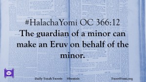 HalachaYomi #HalachaYomi OC 366:12 Date: September 28, 2018Author: ysspitz #HalachaYomi OC 366:12 The guardian of a minor can make an Eruv on behalf of the minor. Share this: Share on X (Opens in new window) X Share on Facebook (Opens in new window) Facebook Like Loading... Related