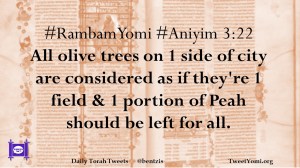 #RambamYomi #Aniyim 3:22 All olive trees on 1 side of city are considered as if they’re 1 field & 1 portion of Peah should be left for all.