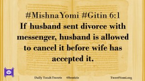 Gitin, MishnaYomi #MishnaYomi #Gitin 6:1 Date: September 30, 2018Author: ysspitz #MishnaYomi #Gitin 6:1 If husband sent divorce with messenger, husband is allowed to cancel it before wife has accepted it. Share this: Share on X (Opens in new window) X Share on Facebook (Opens in new window) Facebook Like Loading... Related