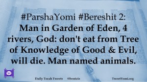#ParshaYomi #Bereshit 2: Man in Garden of Eden, 4 rivers, God: don’t eat from Tree of Knowledge of Good & Evil, will die. Man named animals.