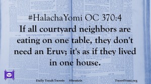 #HalachaYomi OC 370:4 If all courtyard neighbors are eating on one table, they don’t need an Eruv; it’s as if they lived in one house.