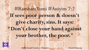 #RambamYomi #Aniyim 7:2 If sees poor person & doesn’t give charity, sins. It says: “Don’t close your hand against your brother, the poor.”