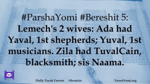 #ParshaYomi #Bereshit 5: Lemech’s 2 wives: Ada had Yaval, 1st shepherds; Yuval, 1st musicians. Zila had TuvalCain, blacksmith; sis Naama.