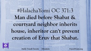#HalachaYomi OC 371:3 Man died before Shabat & courtyard neighbor inherits house, inheritor can’t prevent creation of Eruv that Shabat.