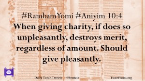 #RambamYomi #Aniyim 10:4 When giving charity, if does so unpleasantly, destroys merit, regardless of amount. Should give pleasantly.