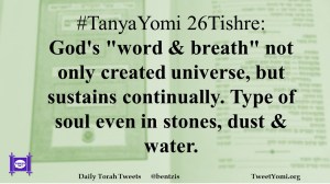 #TanyaYomi 26Tishre: God’s “word & breath” not only created universe, but sustains continually. Type of soul even in stones, dust & water.