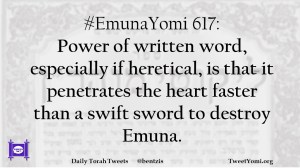 #EmunaYomi 617: Power of written word, especially if heretical, is that it penetrates the heart faster than a swift sword to destroy Emuna.