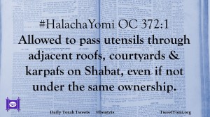 #HalachaYomi OC 372:1 Allowed to pass utensils through adjacent roofs, courtyards & karpafs on Shabat, even if not under the same ownership.