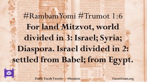 #RambamYomi #Trumot 1:6 For land Mitzvot, world divided in 3: Israel; Syria; Diaspora. Israel divided in 2: settled from Babel; from Egypt.