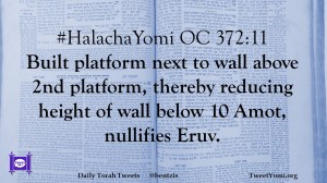#HalachaYomi OC 372:11 Built platform next to wall above 2nd platform, thereby reducing height of wall below 10 Amot, nullifies Eruv.