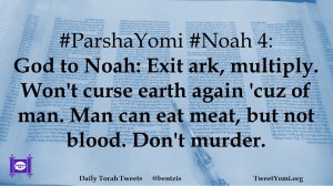 #ParshaYomi #Noah 4: God to Noah: Exit ark, multiply. Won’t curse earth again ‘cuz of man. Man can eat meat, but not blood. Don’t murder.