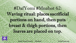 DafYomi, Mnahot #DafYomi #Mnahot 62 Date: October 11, 2018Author: ysspitz #DafYomi #Mnahot 62: Waving ritual: places sacrificial portions on hand, then puts breast & thigh portions, then loaves are placed on top. Share this: Share on X (Opens in new window) X Share on Facebook (Opens in new window) Facebook Like Loading... Related