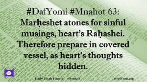 DafYomi, Mnahot #DafYomi #Mnahot 63 Date: October 12, 2018Author: ysspitz #DafYomi #Mnahot 63: Marḥeshet atones for sinful musings, heart’s Raḥashei. Therefore prepare in covered vessel, as heart’s thoughts hidden. Share this: Share on X (Opens in new window) X Share on Facebook (Opens in new window) Facebook Like Loading... Related