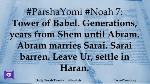 #ParshaYomi #Noah 7: Tower of Babel. Generations, years from Shem until Abram. Abram marries Sarai. Sarai barren. Leave Ur, settle in Haran.