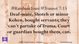 #RambamYomi #Trumot 7:15 Deaf-mute, Shoteh or minor Kohen, bought servants; they can’t partake of Truma. Court or guardian bought them, can.