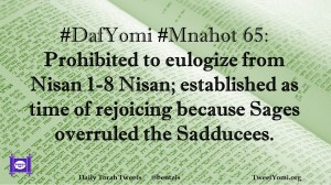 DafYomi, Mnahot #DafYomi #Mnahot 65 Date: October 14, 2018Author: ysspitz #DafYomi #Mnahot 65: Prohibited to eulogize from Nisan 1-8 Nisan; established as time of rejoicing because Sages overruled the Sadducees. Share this: Share on X (Opens in new window) X Share on Facebook (Opens in new window) Facebook Like Loading... Related