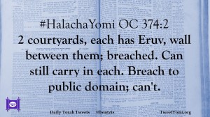 #HalachaYomi OC 374:2 2 courtyards, each has Eruv, wall between them; breached. Can still carry in each. Breach to public domain; can’t.