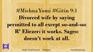 #MishnaYomi #Gitin 9:1 Divorced wife by saying permitted to all except so-and-so: R’ Eliezer: it works. Sages: doesn’t work at all.
