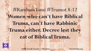 #RambamYomi #Trumot 8:12 Women who can’t have Biblical Truma, can’t have Rabbinic Truma either. Decree lest they eat of Biblical Truma.