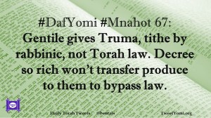 DafYomi, Mnahot #DafYomi #Mnahot 67 Date: October 16, 2018Author: ysspitz #DafYomi #Mnahot 67: Gentile gives Truma, tithe by rabbinic, not Torah law. Decree so rich won’t transfer produce to them to bypass law. Share this: Share on X (Opens in new window) X Share on Facebook (Opens in new window) Facebook Like Loading... Related