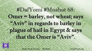 DafYomi, Mnahot #DafYomi #Mnahot 68 Date: October 17, 2018Author: ysspitz #DafYomi #Mnahot 68: Omer = barley, not wheat; says “Aviv” in regards to barley in plague of hail in Egypt & says that the Omer is “Aviv”. Share this: Share on X (Opens in new window) X Share on Facebook (Opens in new window) Facebook Like Loading... Related