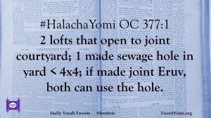 #HalachaYomi OC 377:1 2 lofts that open to joint courtyard; 1 made sewage hole in yard < 4×4; if made joint Eruv, both can use the hole.