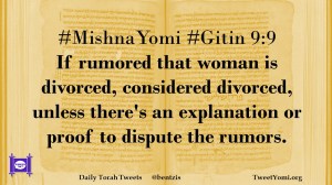 #MishnaYomi #Gitin 9:9 If rumored that woman is divorced, considered divorced, unless there’s an explanation or proof to dispute the rumors.