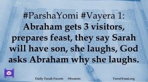 #ParshaYomi #Vayera 1: Abraham gets 3 visitors, prepares feast, they say Sarah will have son, she laughs, God asks Abraham why she laughs.