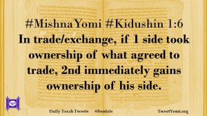 #MishnaYomi #Kiddushin 1:6 In trade/exchange, if 1 side took ownership of what agreed to trade, 2nd immediately gains ownership of his side.