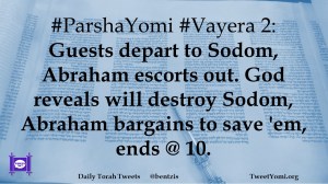#ParshaYomi #Vayera 2: Guests depart to Sodom, Abraham escorts out. God reveals will destroy Sodom, Abraham bargains to save ’em, ends @ 10.