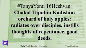 #TanyaYomi 16Heshvan: Chakal Tapuhin Kadishin: orchard of holy apples: radiates over disciples, instills thoughts of repentance, good deeds.