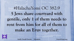 #HalachaYomi OC 382:9 5 Jews share courtyard with gentile, only 1 of them needs to rent from him for all of them to make an Eruv together.