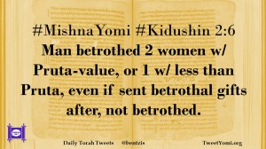 #MishnaYomi #Kidushin 2:6 Man betrothed 2 women w/ Pruta-value, or 1 w/ less than Pruta, even if sent betrothal gifts after, not betrothed.