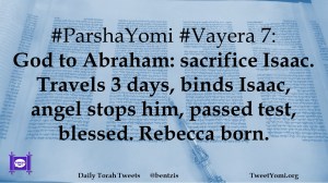 #ParshaYomi #Vayera 7: God to Abraham: sacrifice Isaac. Travels 3 days, binds Isaac, angel stops him, passed test, blessed. Rebecca born.