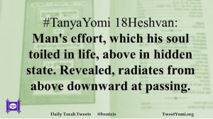 #TanyaYomi 18Heshvan: Man’s effort, which his soul toiled in life, above in hidden state. Revealed, radiates from above downward at passing.