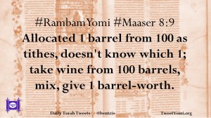 #RambamYomi #Maaser 8:9 Allocated 1 barrel from 100 as tithes, doesn’t know which 1; take wine from 100 barrels, mix, give 1 barrel-worth.