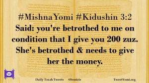 #MishnaYomi #Kidushin 3:2 Said: you’re betrothed to me on condition that I give you 200 zuz. She’s betrothed & needs to give her the money.