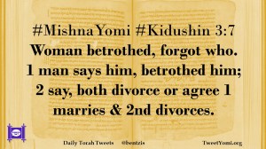 #MishnaYomi #Kidushin 3:7 Woman betrothed, forgot who. 1 man says him, betrothed him; 2 say, both divorce or agree 1 marries & 2nd divorces.