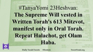 #TanyaYomi 23Heshvan: The Supreme Will vested in Written Torah’s 613 Mitzvot, manifest only in Oral Torah. Repeat Halachot, get Olam Haba.