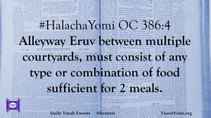 #HalachaYomi OC 386:4 Alleyway Eruv between multiple courtyards, must consist of any type or combination of food sufficient for 2 meals.