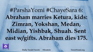 #ParshaYomi #ChayeSara 6: Abraham marries Ketura, kids: Zimran, Yokshan, Medan, Midian, Yishbak, Shuah. Sent east w/gifts. Abraham dies 175.