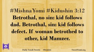#MishnaYomi #Kiddushin 3:12 Betrothal, no sin: kid follows dad. Betrothal, sin: kid follows defect. If woman betrothed to other, kid Mamzer.