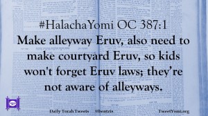 #HalachaYomi OC 387:1 If make alleyway Eruv, also need to make courtyard Eruv, so kids won’t forget Eruv laws; their not aware of alleyways.