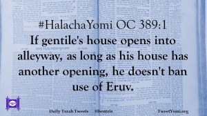 #HalachaYomi OC 389:1 If gentile’s house opens into alleyway, as long as his house has another opening, he doesn’t ban use of Eruv.
