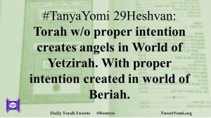 #TanyaYomi 29Heshvan: Torah w/o proper intention creates angels in World of Yetzirah. With proper intention created in world of Beriah.