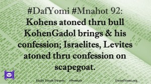 DafYomi, Mnahot #DafYomi #Mnahot 92 Date: November 9, 2018Author: ysspitz #DafYomi #Mnahot 92: Kohens atoned thru bull KohenGadol brings & his confession; Israelites, Levites atoned thru confession on scapegoat. Share this: Share on X (Opens in new window) X Share on Facebook (Opens in new window) Facebook Like Loading... Related